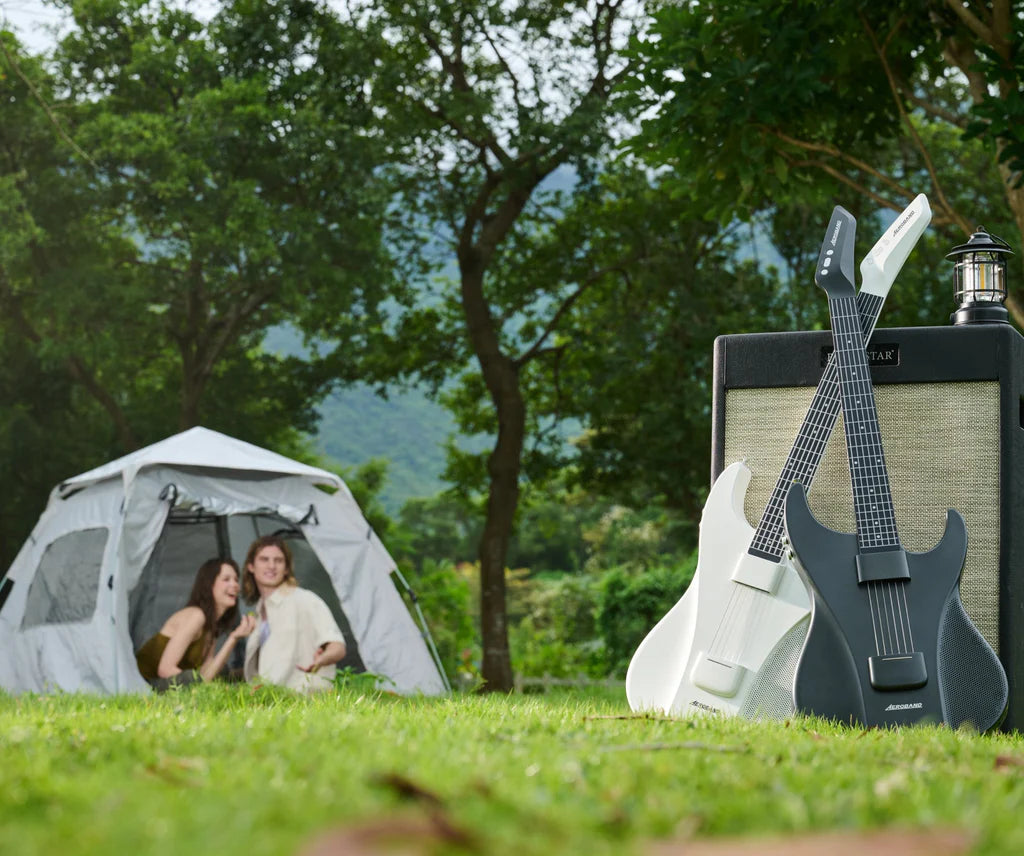 - Contains: White AeroBand Guitar and Black Guitar Bag